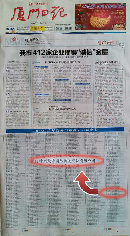 2016/12/7,厦门神州聚海国际物流股份有限公司历时9个多月,通过厦门海关、国税、地税、质监、厦门日报(微博)社、诚信促进会等25个单位共同组成的诚信企业综合考察队的评审,摘得“2014-2015年度厦门市诚信示范企业”金匾。