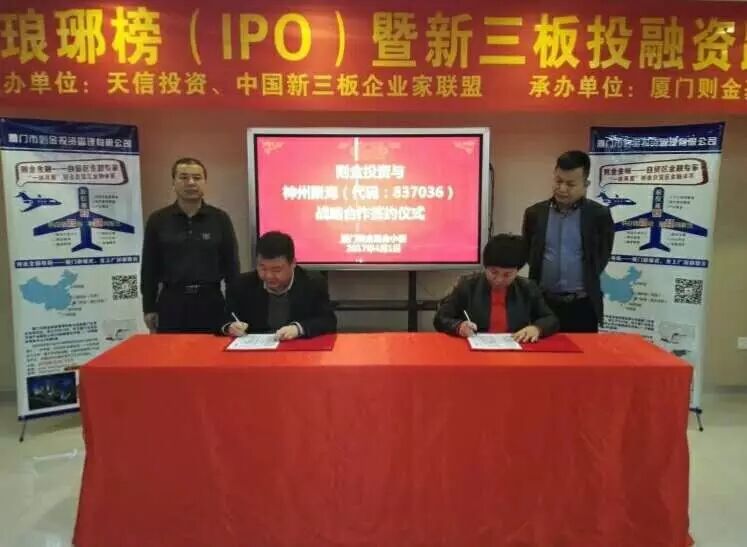 4月1日神州聚海董事长陈飞燕女士与则金投资董事长谢腾在厦门则金基金小镇举办战略合作签约仪式。则金供应链执行董事谢峰和神州聚海董事朱卫锋共同出席。此次战略合作,由则金投资及旗下则金供应链为神州聚海提供市值管理综合服务,推进神州聚海快速发展。